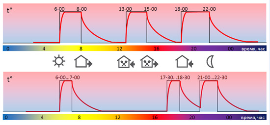 События, когда следует включать или выключать тёплый пол, обозначены вот такими стилизованными значками: солнце встало, ушёл на работу, пришёл на обед, опять пошёл на работу, вечером пришёл домой, взошла луна – всем спать.